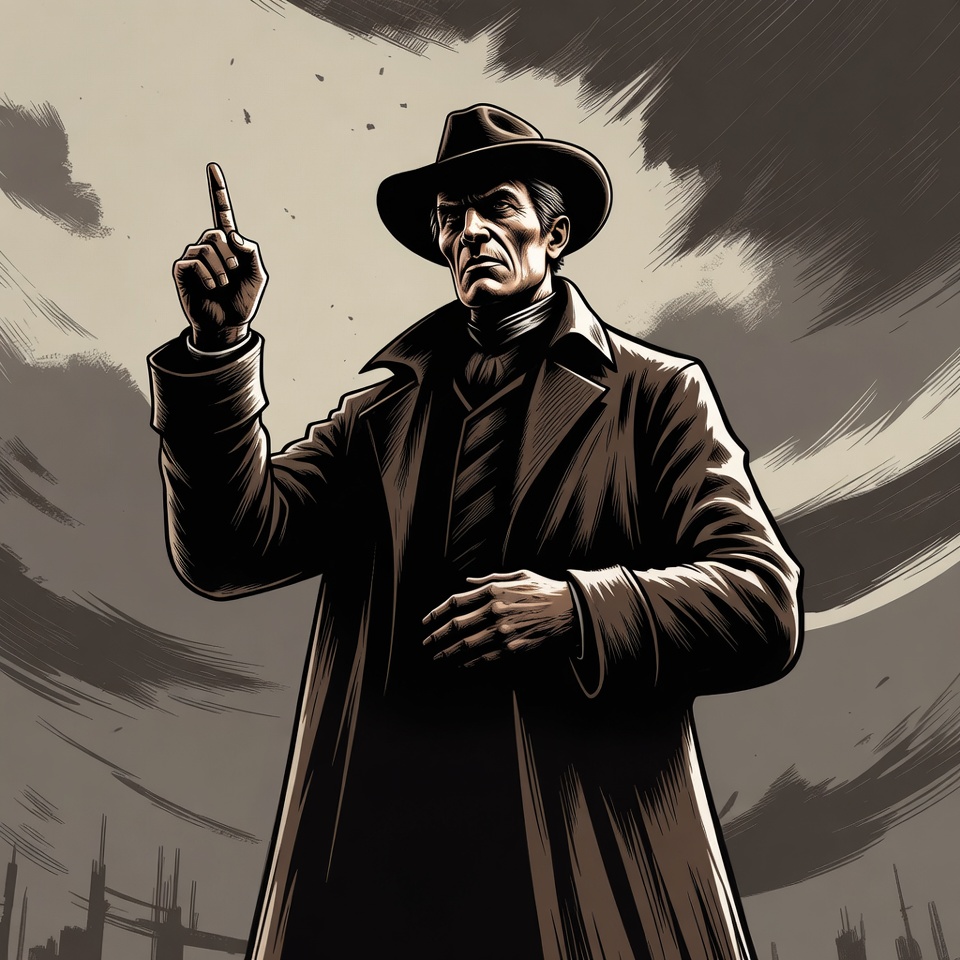 A stern man with a fedora hat and trench coat stands dramatically against a stormy urban skyline. He raises his right hand with index finger extended upward, while his left hand rests at his side. The illustration features a sepia-toned, gritty style with dark clouds and cityscape in the background.