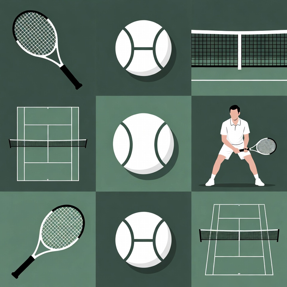 A minimalist illustration features a White male tennis player in white uniform poised to serve on a green background. Surrounding him are white tennis rackets, balls, nets, and court elements arranged in a grid pattern. The flat vector style emphasizes clean lines and isolated objects.