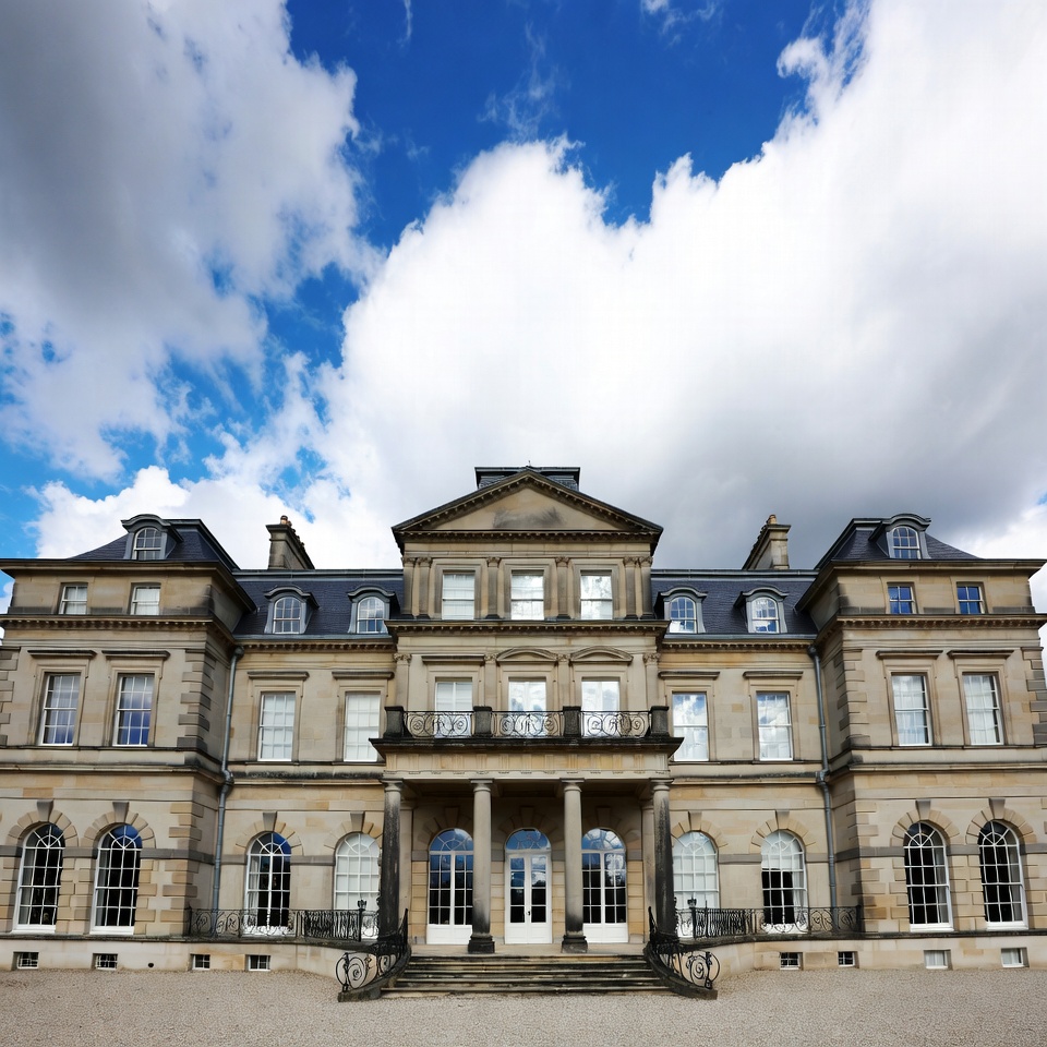 architecture, blue sky, chimneys, clouds, columns, courtyard, doors, elegant home, estate, grand mansion, gravel, historic house, pediment, steps, stone building, symmetric facade, windows, mansion