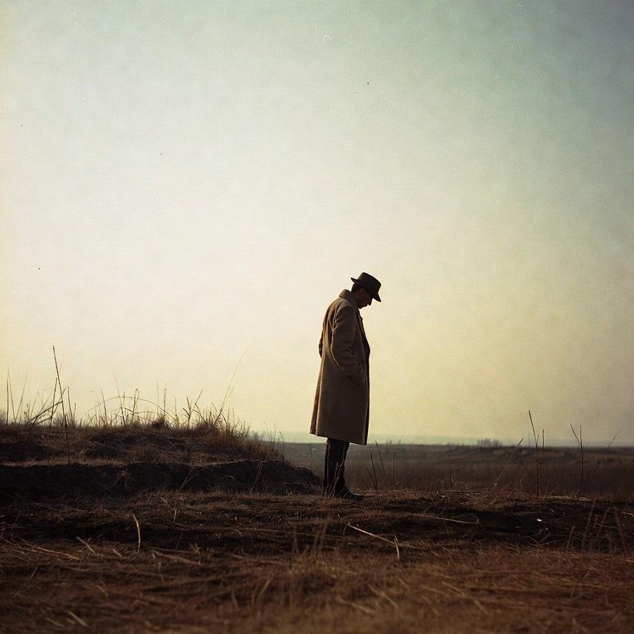 A man wearing a beige trench coat and fedora hat stands with his back turned in a vast grassy field. He gazes thoughtfully at the expansive horizon under a hazy sky. Tall dry grass surrounds his feet on the earthy ground.