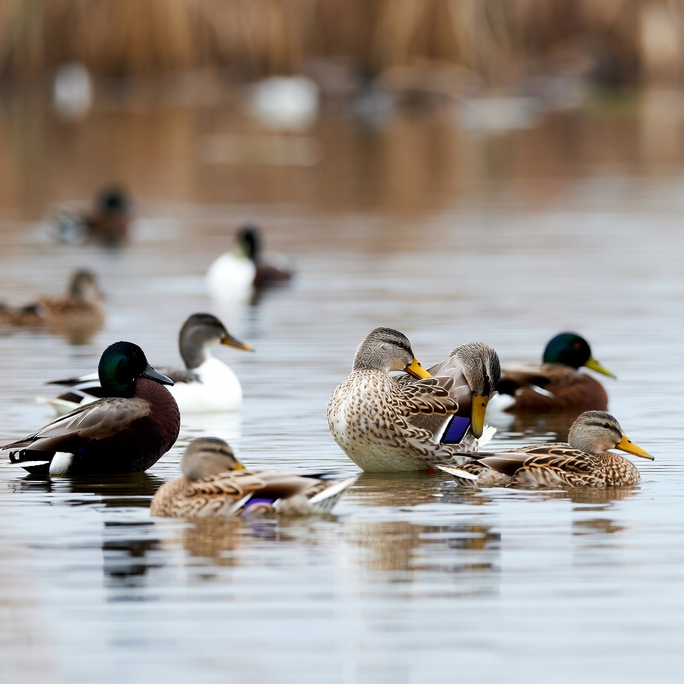 bird group, brown duck, feathers, flock of ducks, green head duck, lake, mallard ducks, nature, outdoors, pond, reeds background, swimming, swimming ducks, water birds, waterfowl, white duck, wildlife, yellow bill, ducks