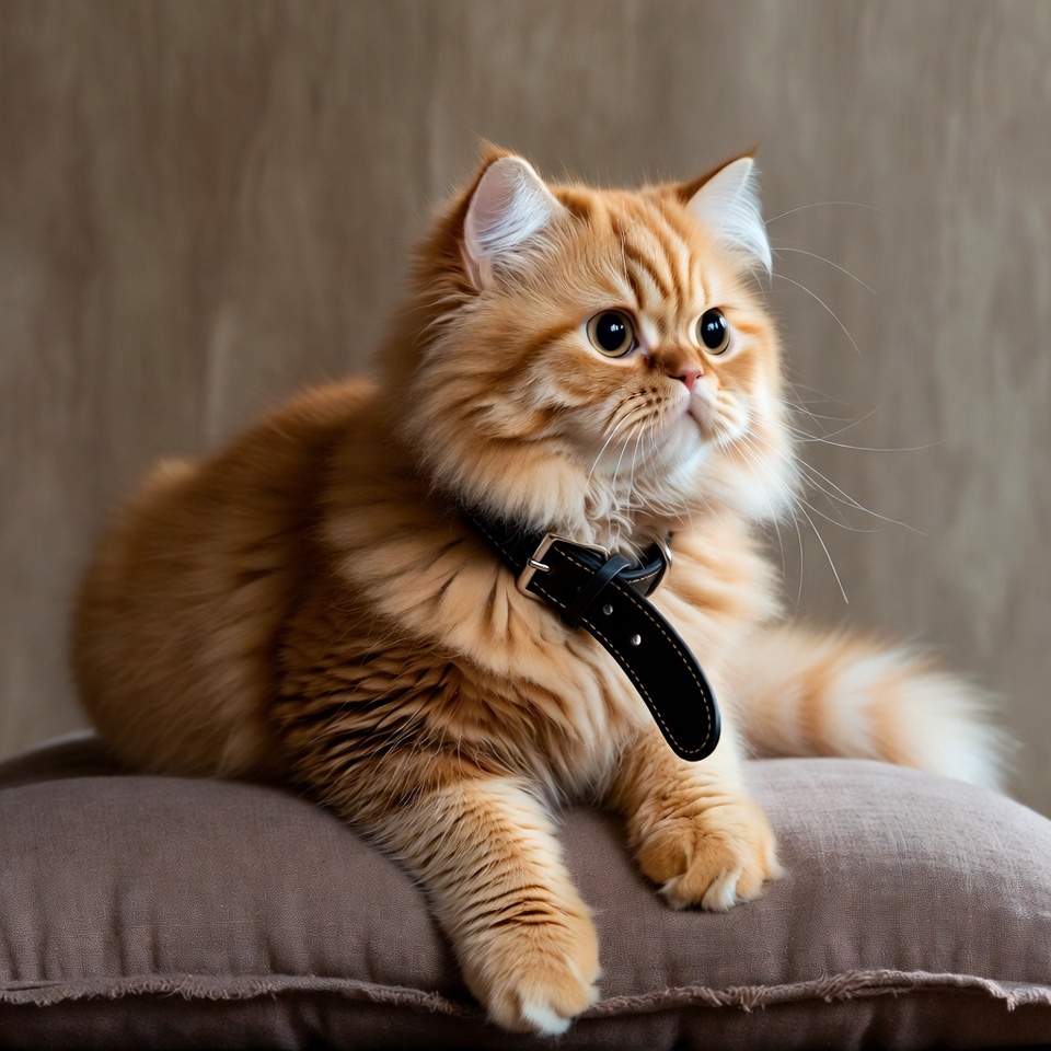 A fluffy orange Persian kitten with wide green eyes sits on a beige cushion. It wears a black leather collar and gazes forward attentively. Its long fur and white paws stand out against the neutral background.