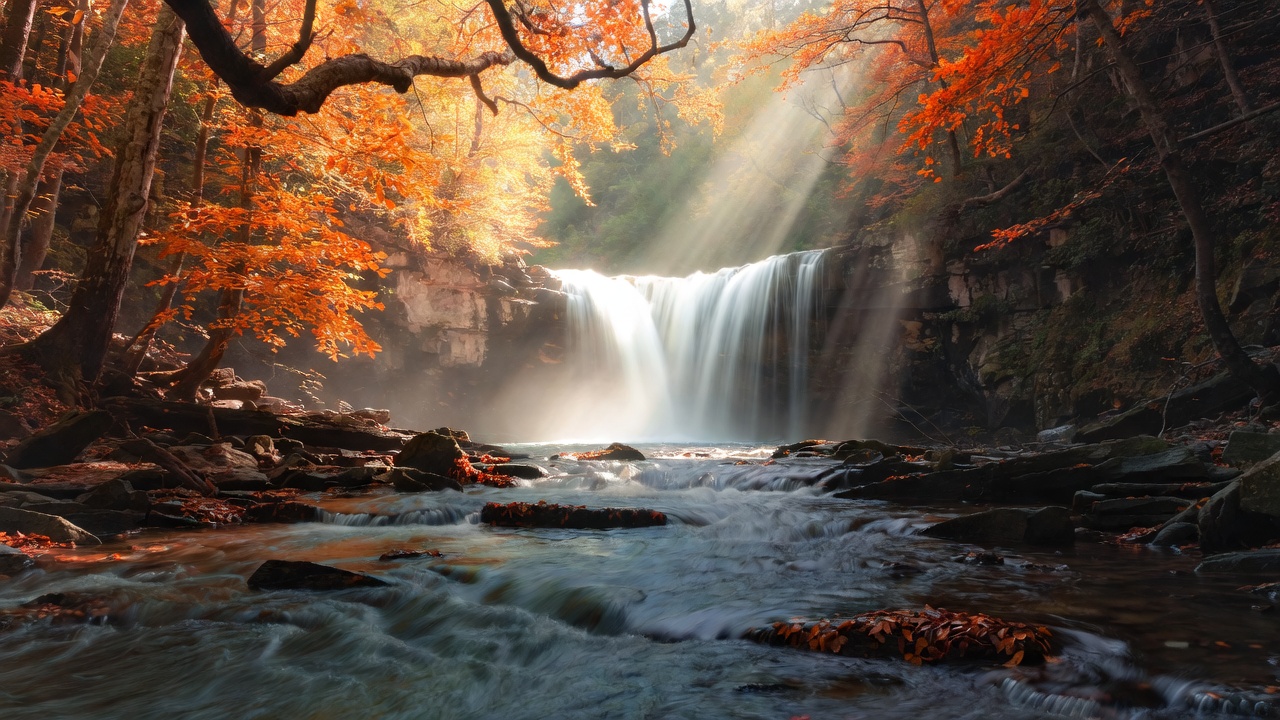 autumn, branches, cascade, fall foliage, flowing water, foliage, forest, golden light, gorge, landscape, mist, mossy rocks, nature, orange leaves, outdoors, red leaves, river, rocks, scenic, serene, sunbeams, sunlight, trees, vibrant colors, woodland, waterfall