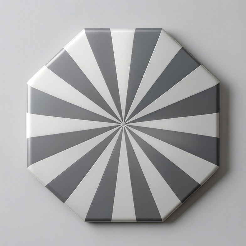 A glossy octagonal tile features alternating gray and white radial stripes converging at the center. The design creates a striking starburst pattern on an isolated gray background. The tile has a smooth, reflective surface with clean, symmetrical lines.