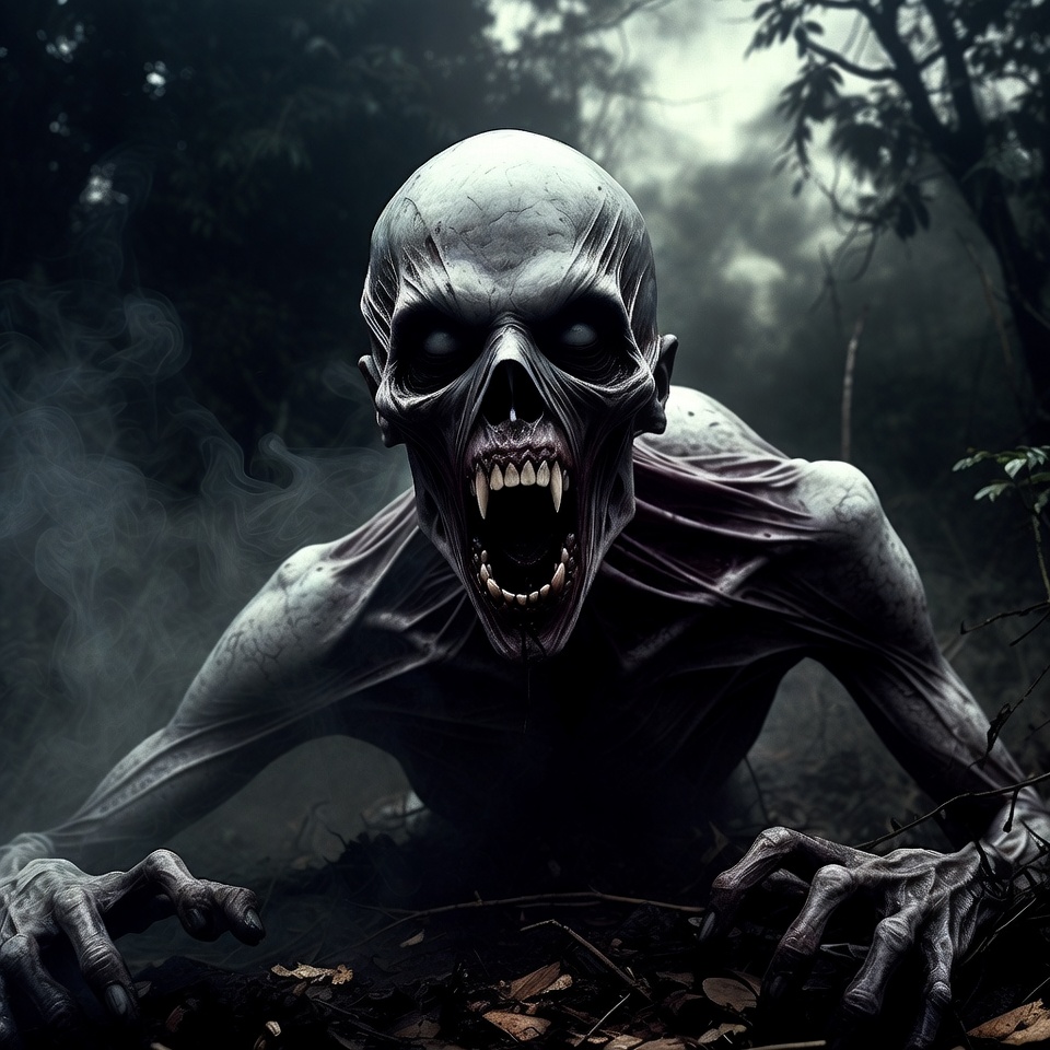 Halloween, aggressive pose, claws, crouching, dark forest, digital art, eerie atmosphere, emaciated, fangs, foggy woods, gray skin, hollow eyes, horror, illustration, leaves, mist, monster, night forest, pale skin, scary, skull face, snarling, terrifying creature, trees, undead, zombie