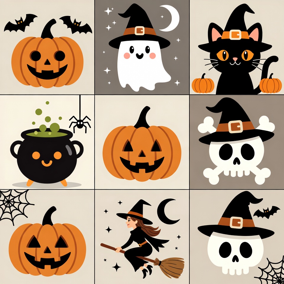 A 3x3 grid features colorful cartoon Halloween icons on a light gray background. It includes jack-o'-lantern pumpkins with carved faces, a black cat wearing a witch hat, a smiling ghost, a bubbling cauldron with spider web, a witch flying on a broomstick, and white skull faces. Additional elements like bats, crescent moons, and bats enhance the festive Halloween theme.