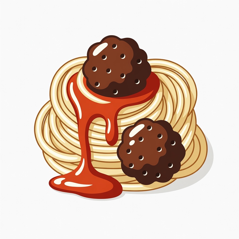 A colorful cartoon illustration of spaghetti with two meatballs on top and red tomato sauce dripping down the sides. The pasta is coiled in a pile with glossy highlights on the noodles and meatballs. It is presented on a plain white background.