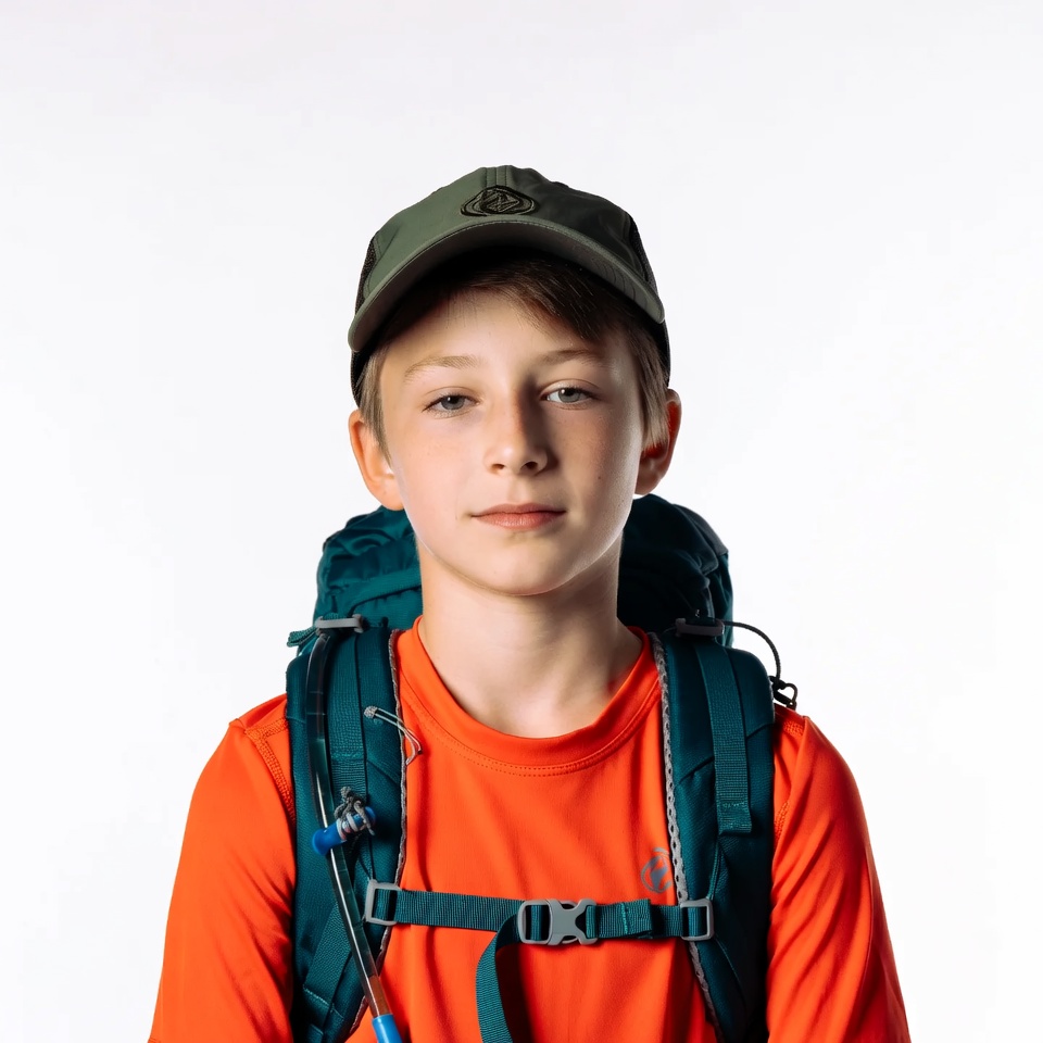 A young boy with short brown hair stands facing the camera against a white background. He wears a green cap, an orange short-sleeve shirt, and a teal backpack with a hydration tube. His expression is neutral with hands at his sides.