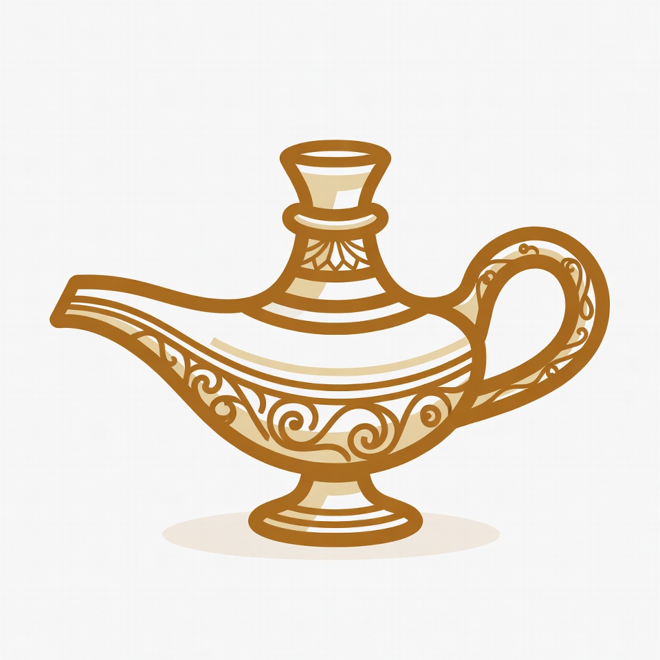 Aladdin lamp, Arabian lamp, clipart, decorative lamp, fantasy lamp, gold color, golden lamp, illustration, isolated background, magic lamp, ornate design, swirling patterns, vector art, wish lamp, genie lamp