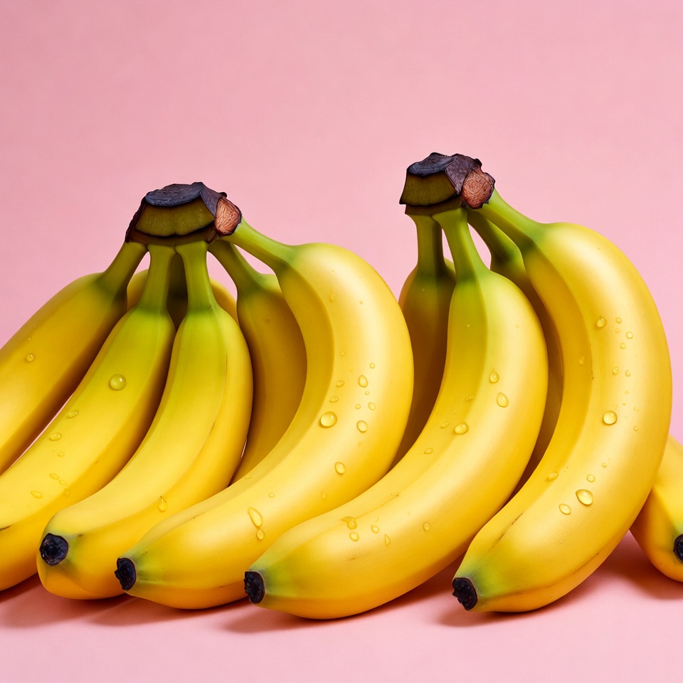A cluster of ripe yellow bananas with water droplets is arranged on a solid pink background. The bananas feature green tips and smooth, glossy peels. They are positioned in a neat bunch, isolated for a clean presentation.