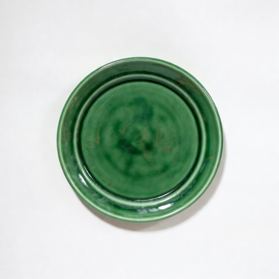 ceramic plate, dinner plate, dishware, glossy plate, green dish, isolated background, kitchenware, pottery, round plate, tableware, top view, white background, green plate