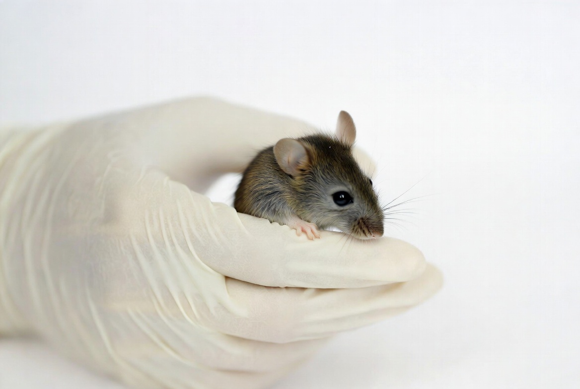 Gloved hand holding small mouse