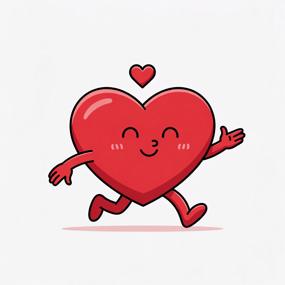 A vibrant red heart character with happy eyes and blushing cheeks runs joyfully with arms outstretched. It features small pink hearts above its head and simple legs in motion. The cartoon illustration is set against a plain white background.