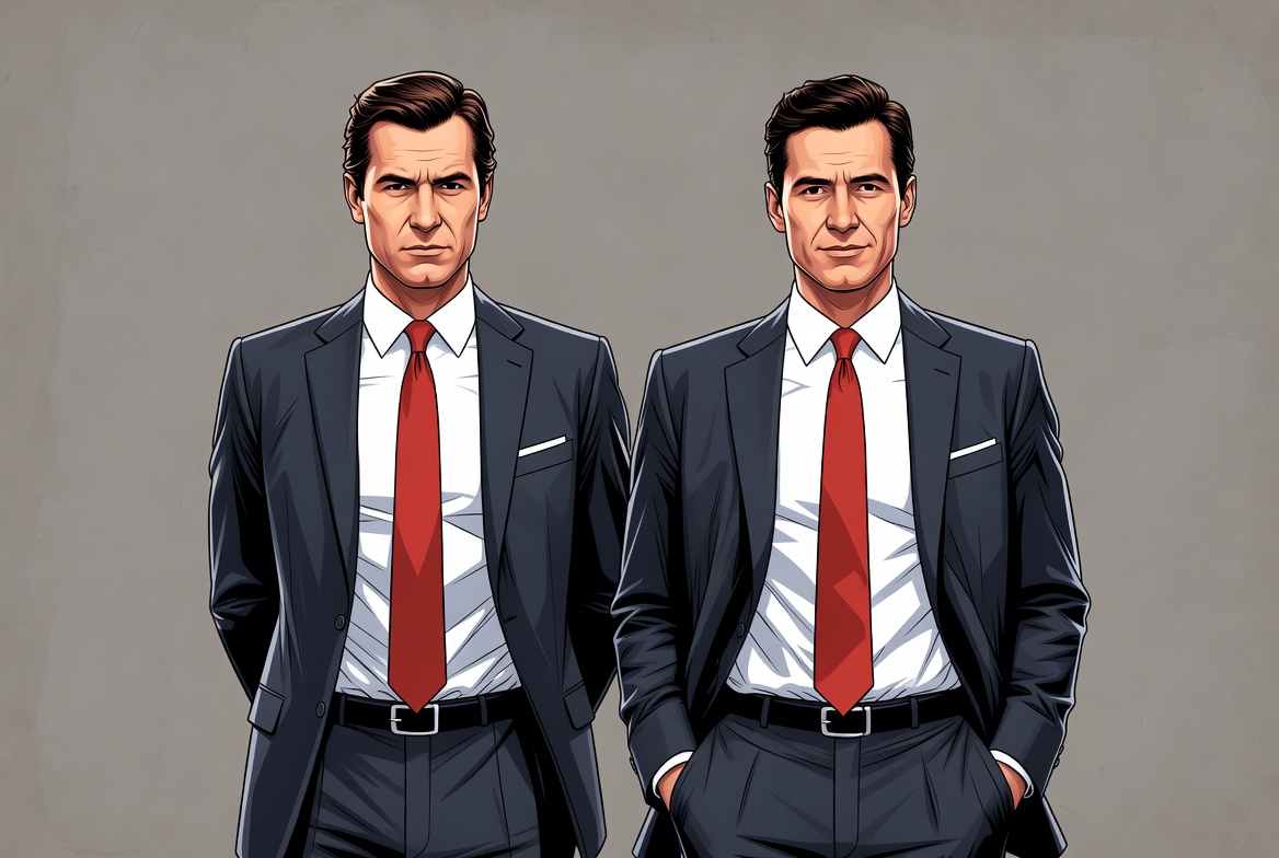 An illustration features two identical men standing side by side against a gray background. Both wear navy blue suits, white dress shirts, red ties, and black belts, with hands in pockets. They have short brown hair and serious expressions.