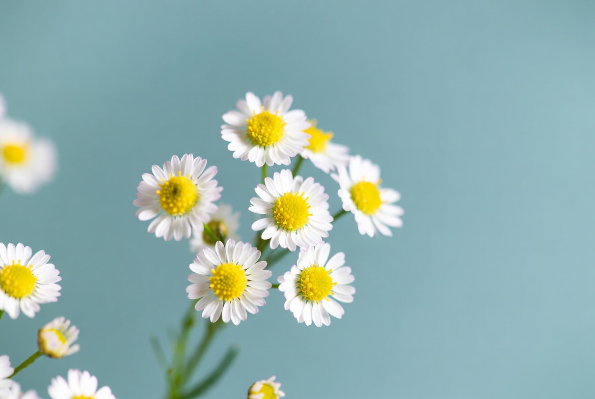 blooms, blue background, close-up, daisy flowers, floral arrangement, flower cluster, flowers, fresh flowers, garden flowers, green stems, isolated background, nature, petals, spring flowers, white daisies, white petals, yellow centers, daisies