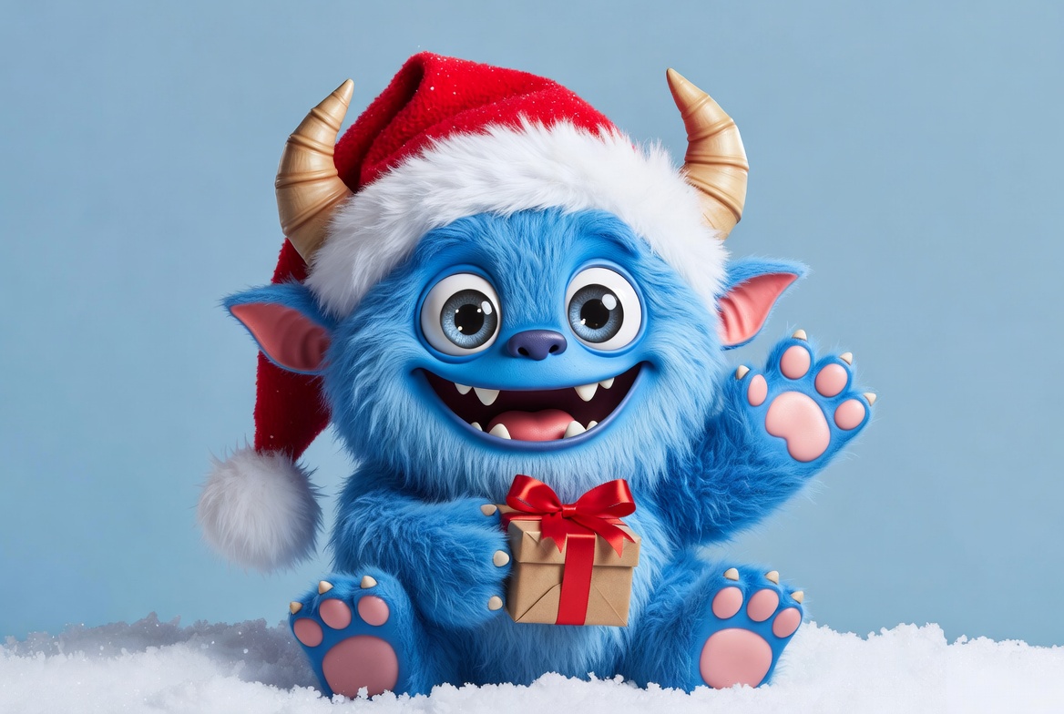 A cute blue furry monster with horns wears a red Santa hat and holds a red-ribboned gift box. It has big expressive eyes, a wide smile, and waves one paw while sitting on snow. The background is a solid light blue with snow underneath.