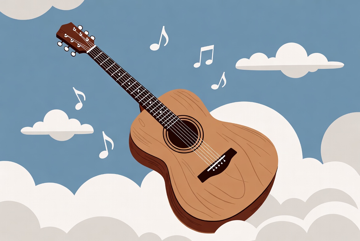 A cartoon acoustic guitar floats against a blue sky background with fluffy white clouds. Musical notes in various sizes surround the guitar, drifting upwards. The guitar features a wooden body, brown neck, and silver tuning pegs.