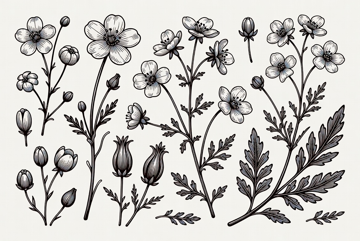 anemone, black white, botany, buds, clipart, doodle, floral, flowers, hand drawn, illustration, ink drawing, isolated background, leaves, line art, plant elements, sketch, stems, vector style, white flowers, anemone flowers