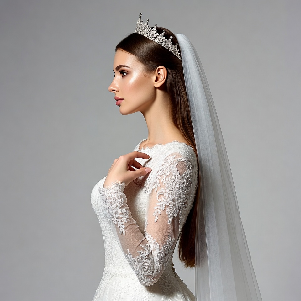 A woman with long straight brown hair stands in profile wearing a white lace wedding dress with long sleeves. She has a sparkling tiara on her head and a long white veil flowing down her back. Her hand touches her chest against a plain gray background.