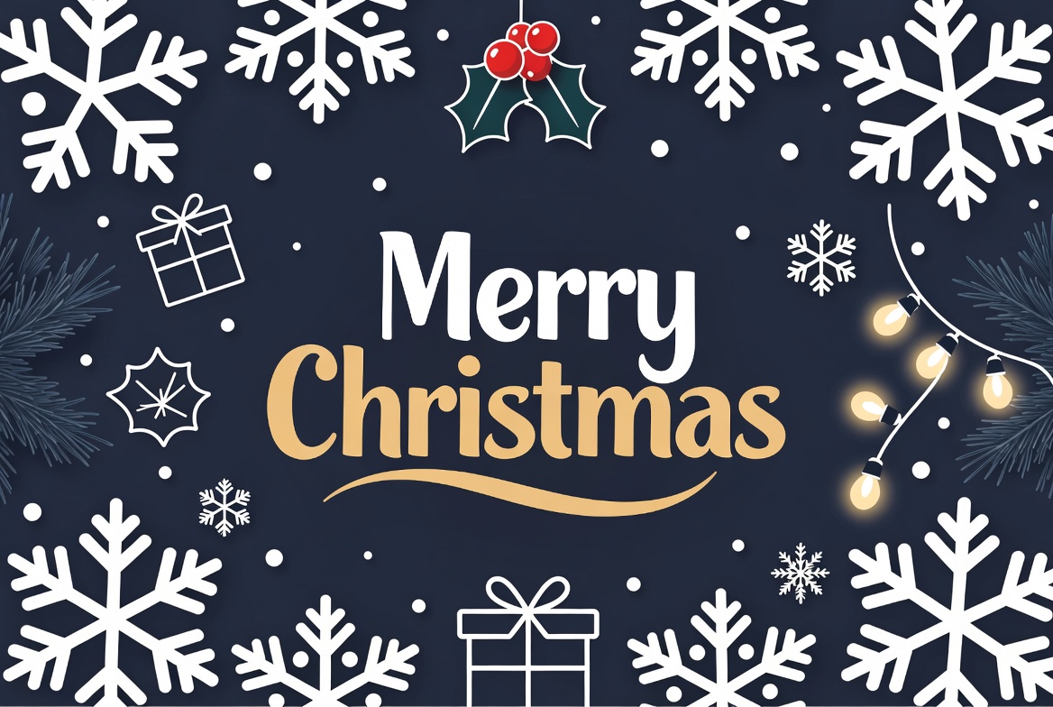 A festive Merry Christmas greeting in gold text on a navy blue background. The design features white snowflakes, holly leaves with red berries, gift boxes, string lights, and pine branches surrounding the text. It is a clipart-style illustration with an isolated background.