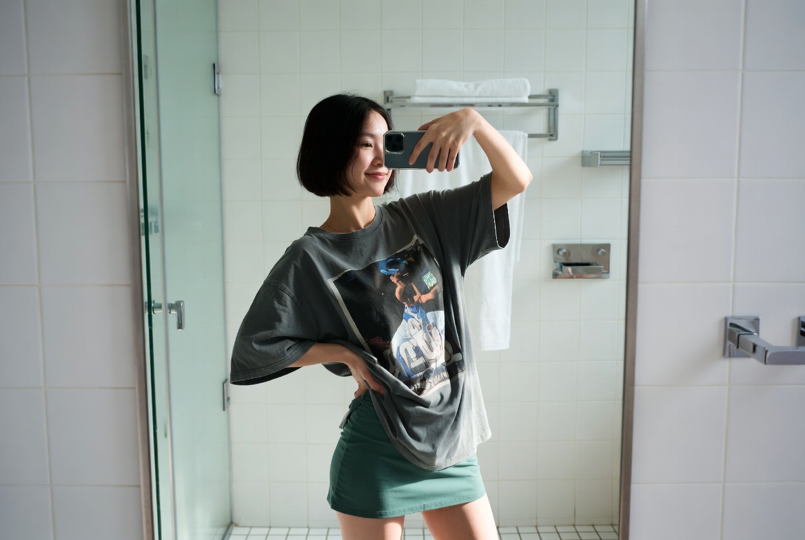A young Asian woman with short black hair takes a selfie in a modern bathroom mirror. She wears an oversized gray graphic t-shirt and a short green skirt, posing with one hand on her hip. A white towel hangs on a rack beside the glass shower door.