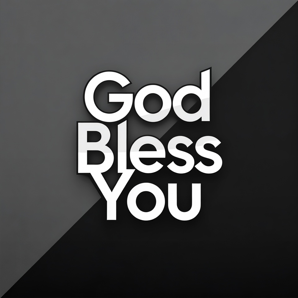 Bold white text reading 'God Bless You' is displayed on a diagonal split gray and black background. The letters have a glossy, 3D effect with shadows for depth. The design features a clean, modern graphic style.