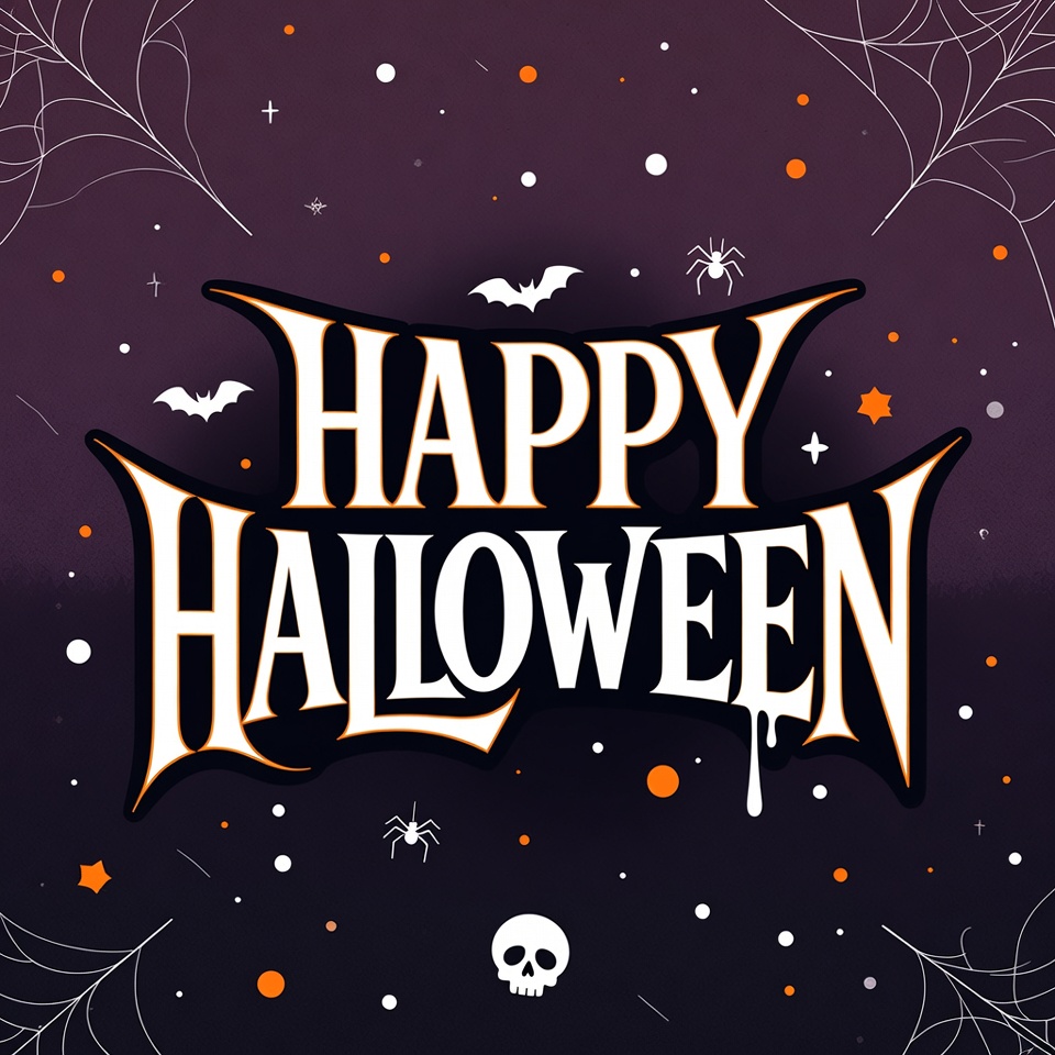 Halloween, Halloween card, bats, bats flying, clipart, cobwebs, dripping letters, festive, ghosts, holiday graphic, illustration, isolated background, jack o lantern, purple background, skull, spider web, spiders, spooky, stars, white text, Happy Halloween