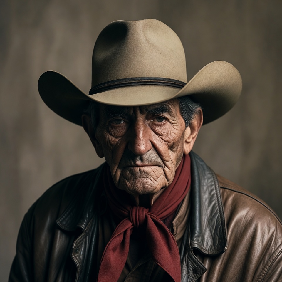 White, beige hat, brown jacket, cowboy hat, elderly man, isolated background, leather jacket, male, neck scarf, old man, portrait, red bandana, rugged man, serious expression, western attire, wide brim hat, wrinkled face, cowboy