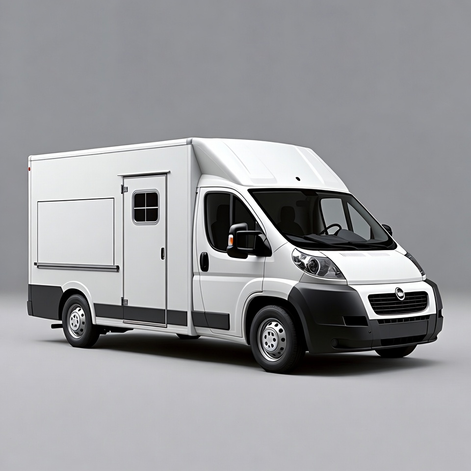 3D render, Fiat Ducato, blank panel, box truck, cargo van, commercial vehicle, delivery van, front view, gray background, high roof van, isolated background, side door, side view, truck, vehicle, wheels, white van