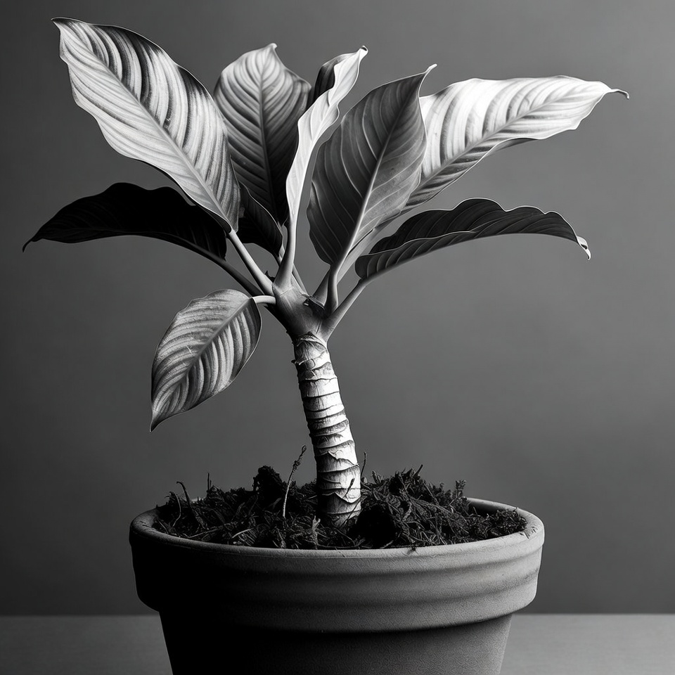 A potted plant with broad, veined leaves sits in a simple terracotta pot on a plain surface. The image is captured in black and white, highlighting the textured leaves and sturdy stem. Soil is visible at the base of the plant.