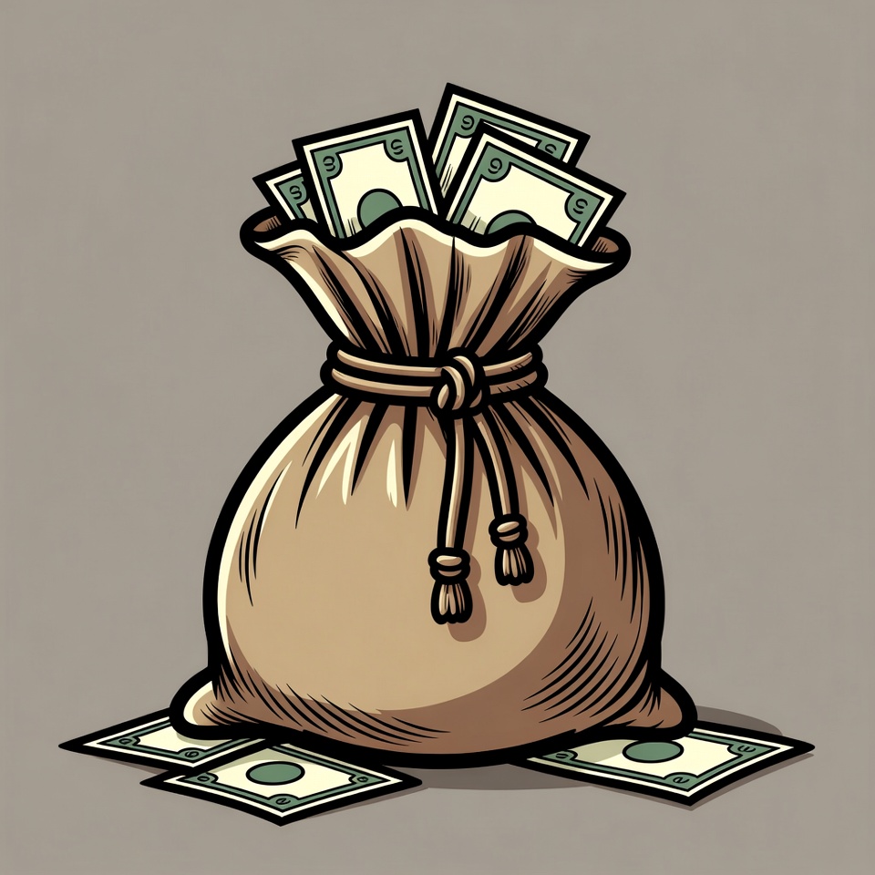 A brown cloth money bag tied at the top overflows with green dollar bills. Scattered dollar bills lie on the ground around the base of the bag. The illustration features a hand-drawn, cartoon style on a gray background.