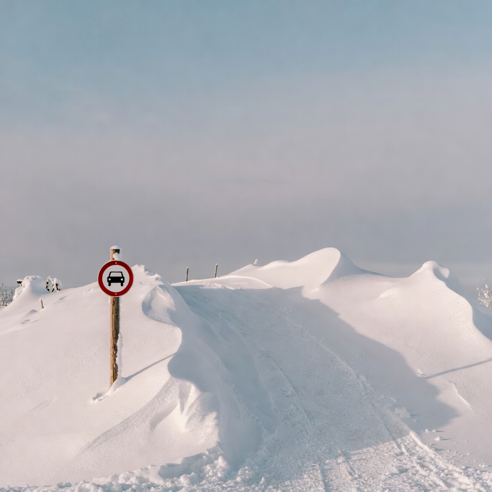arctic scene, blizzard, cloudy sky, cold weather, fence, ice, mountains, no vehicles, powder snow, prohibited sign, red sign, road closed, signpost, snow, snow drifts, snowy landscape, white snow, winter, wooden post, no entry sign