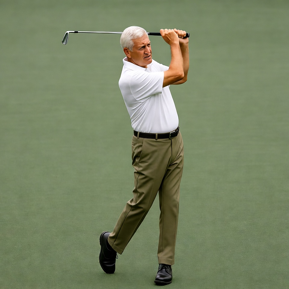 An elderly White man with white hair swings a golf club mid-action on a green golf course. He wears a white polo shirt, khaki pants, and black shoes. His body is twisted in a dynamic golf swing pose against the turf background.