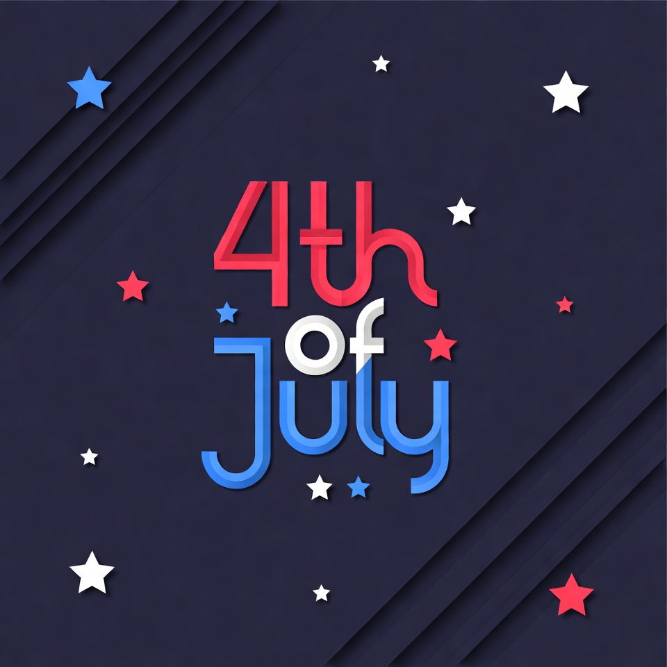 Bold '4th of July' text in red, white, and blue colors stands out against a dark geometric background. Scattered stars in red, white, and blue surround the festive lettering. The design features diagonal lines for a modern look.