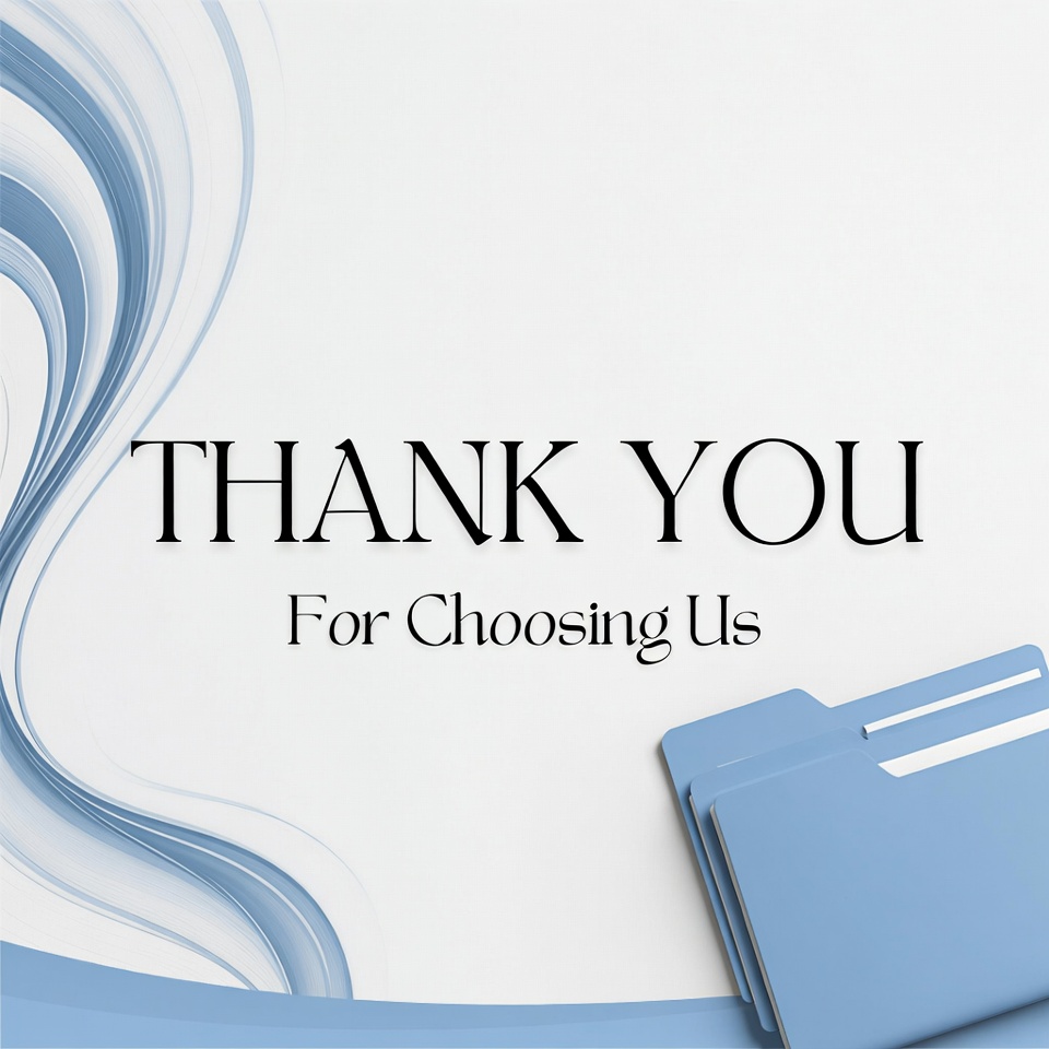 A digital illustration features bold 'THANK YOU' text above 'For Choosing Us' on a white background with swirling blue abstract waves. A stack of blue folders sits in the bottom right corner. The design uses clean typography and simple graphics for a professional thank you message.