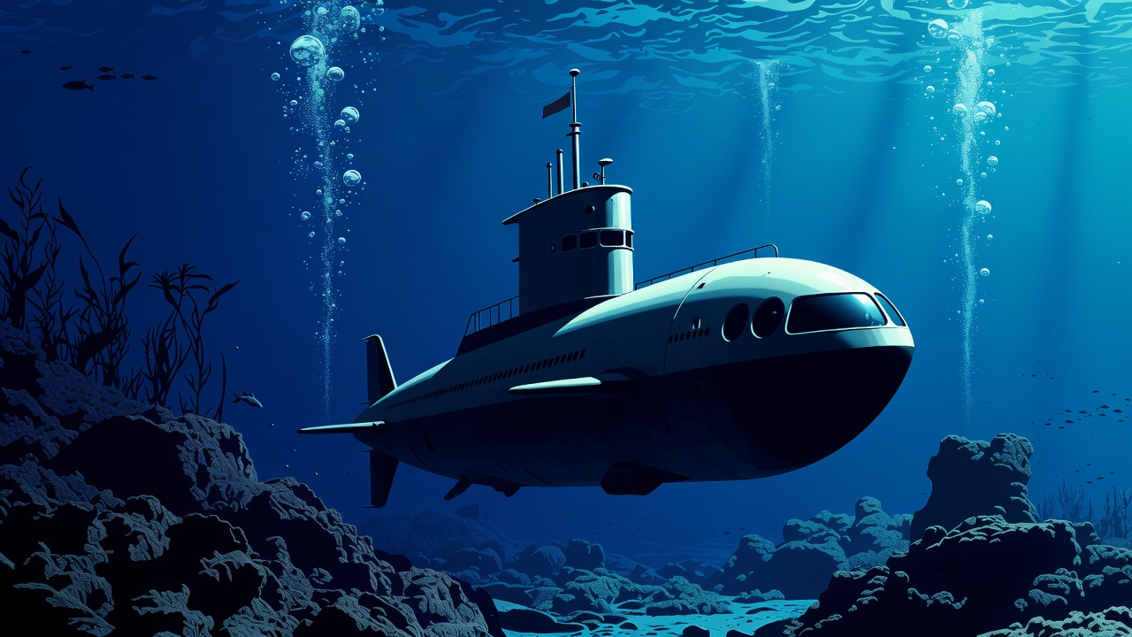 A detailed digital illustration depicts a sleek white submarine gliding through dark ocean depths. It navigates past underwater rocks, seaweed, and small fish, surrounded by rising bubbles and shafts of light. The submarine features a periscope, flag, and large front windows.