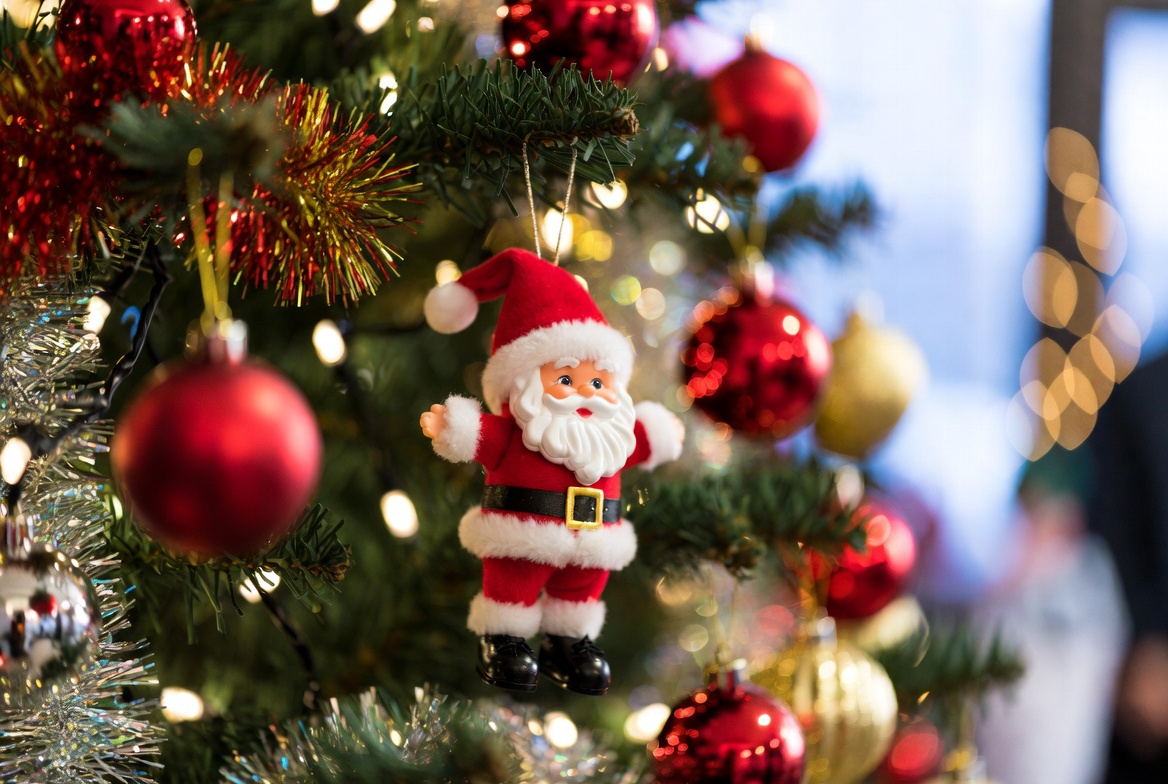 A small Santa Claus figurine with red suit, white beard, and black boots hangs from a branch of a decorated Christmas tree. The tree is adorned with red, gold, and silver ornaments, twinkling lights, and tinsel. The background features a blurred window with soft lighting.
