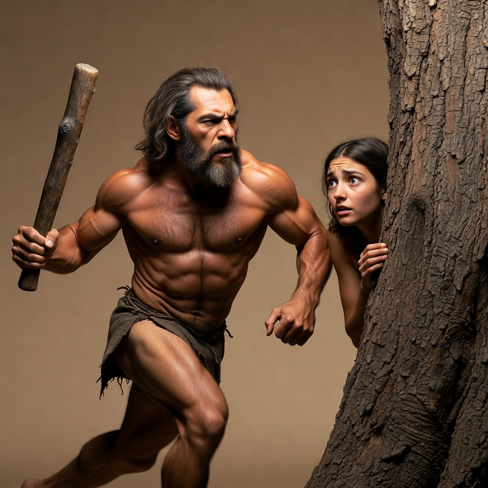 Stone Age, abs, action pose, ancient man, bark, beard, chase, dark hair, dramatic lighting, fear, hiding, loincloth, long hair, muscular man, peeking, primitive, running, shirtless, tree trunk, tribal, woman, wood, wooden club, young woman, caveman