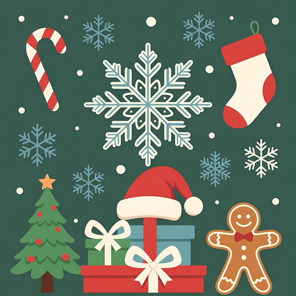 A colorful illustration features a cheerful gingerbread man standing beside wrapped Christmas gifts and a small decorated tree. Snowflakes, candy canes, a red stocking, and a Santa hat float around on a green background. The festive clipart elements are outlined in a flat, cartoonish style.