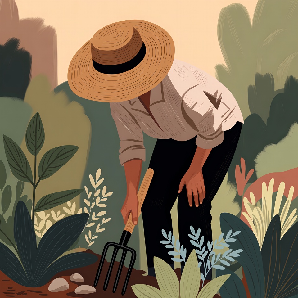 White, backyard, bending over, black pants, clipart style, cultivating, digging soil, earthy tones, farming, ferns, garden, green foliage, hand drawn, illustration, male, man, nature, outdoor, pitchfork, plants, rocks, straw hat, vegetation, white shirt, gardening man
