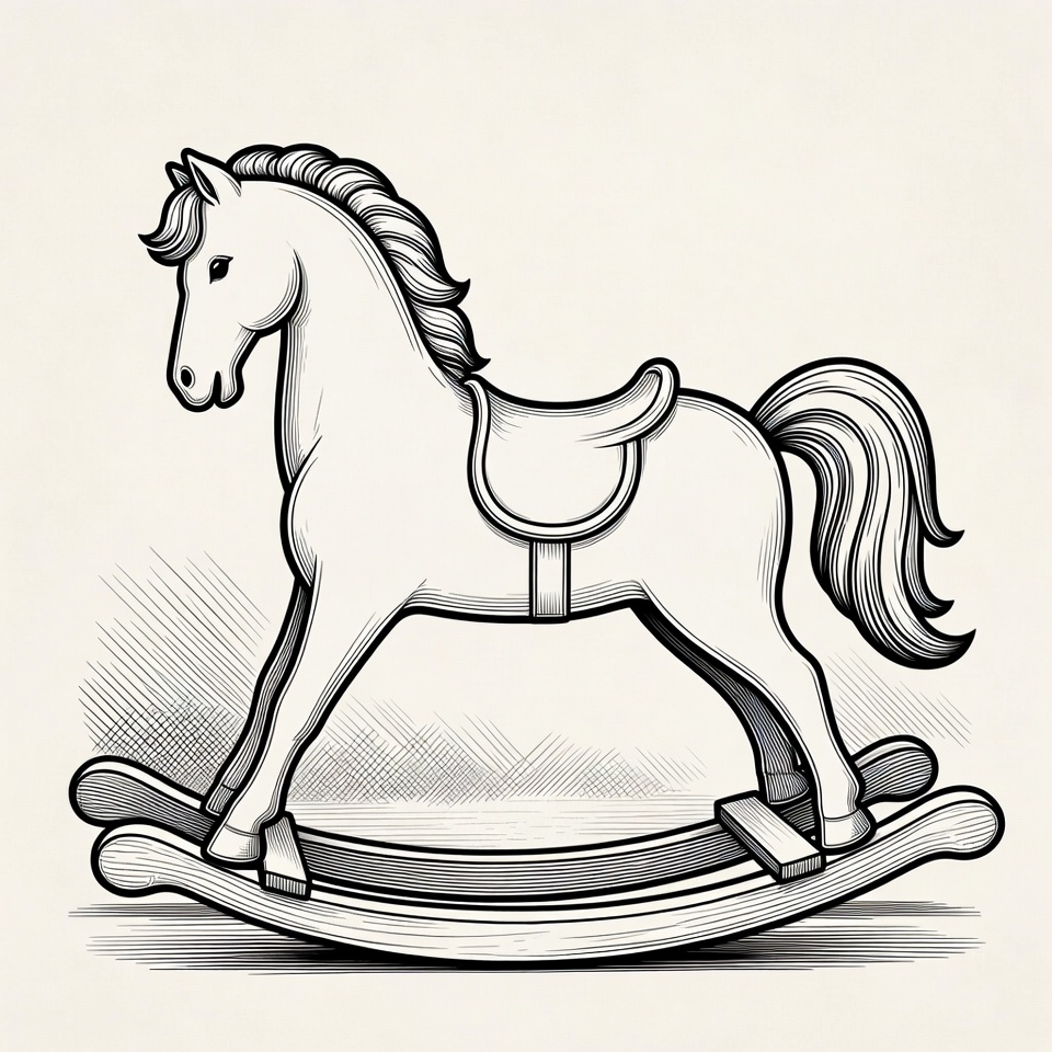 A detailed black and white line art illustration of a classic rocking horse. The horse features a flowing mane and tail, with a saddle on its back and curved rockers at the base. It is depicted in a side view on an isolated white background.