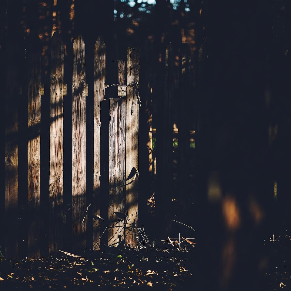 autumn, backlit, barrier, bokeh, dark background, fallen leaves, fence slats, foliage, forest, forest path, golden hour, natural light, nature, outdoor scene, outdoors, picket fence, pine trees, rustic, shadows, sunlight, timber fence, trees, vertical lines, weathered wood, woodland, woods, wooden fence