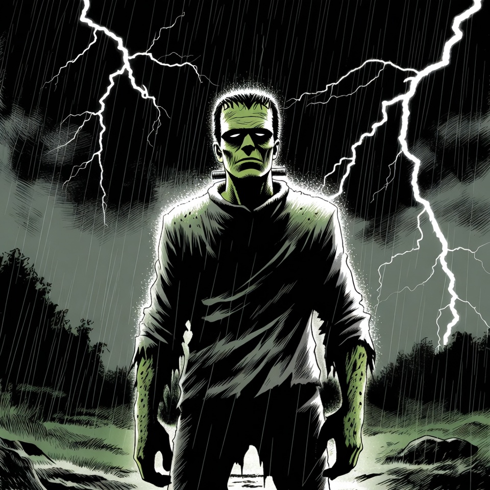 Frankenstein, bolts neck, classic horror, comic art, dark night, dark sky, dramatic lighting, green monster, green skin, horror character, illustration, isolated background, lightning bolts, lightning storm, monster, rain, standing pose, stitches, stormy weather, tattered suit, thunderstorm, trees background, wet ground, Frankenstein monster