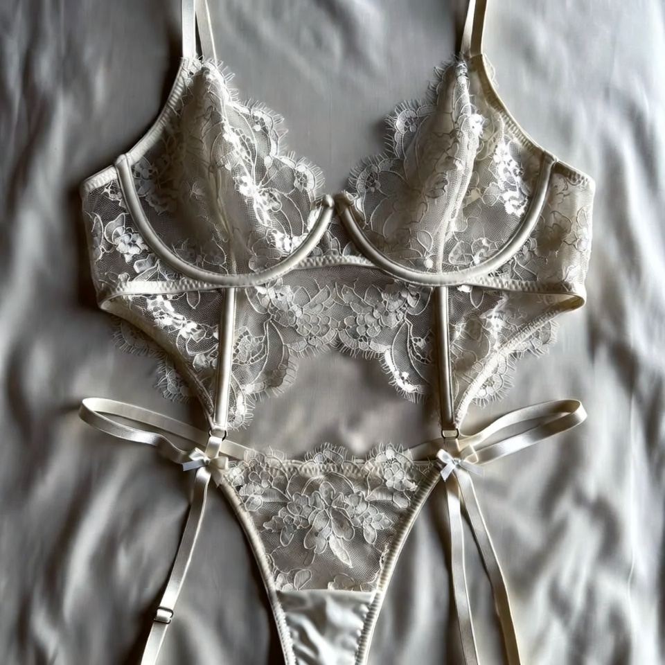 A delicate white lace lingerie set lies flat on a white bed sheet. The set features a bra with intricate floral lace patterns, matching garter belt with thin straps, and panties. Sheer lace panels and satin ribbons add elegance to the design.