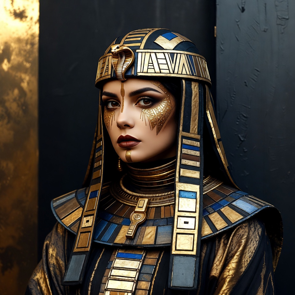 A woman with striking makeup and dark hair wears an elaborate Egyptian pharaoh headdress featuring a golden cobra and blue stripes. She has gold jewelry around her neck and wears a detailed gold and blue costume with intricate patterns. She poses confidently against a dark background with golden highlights.