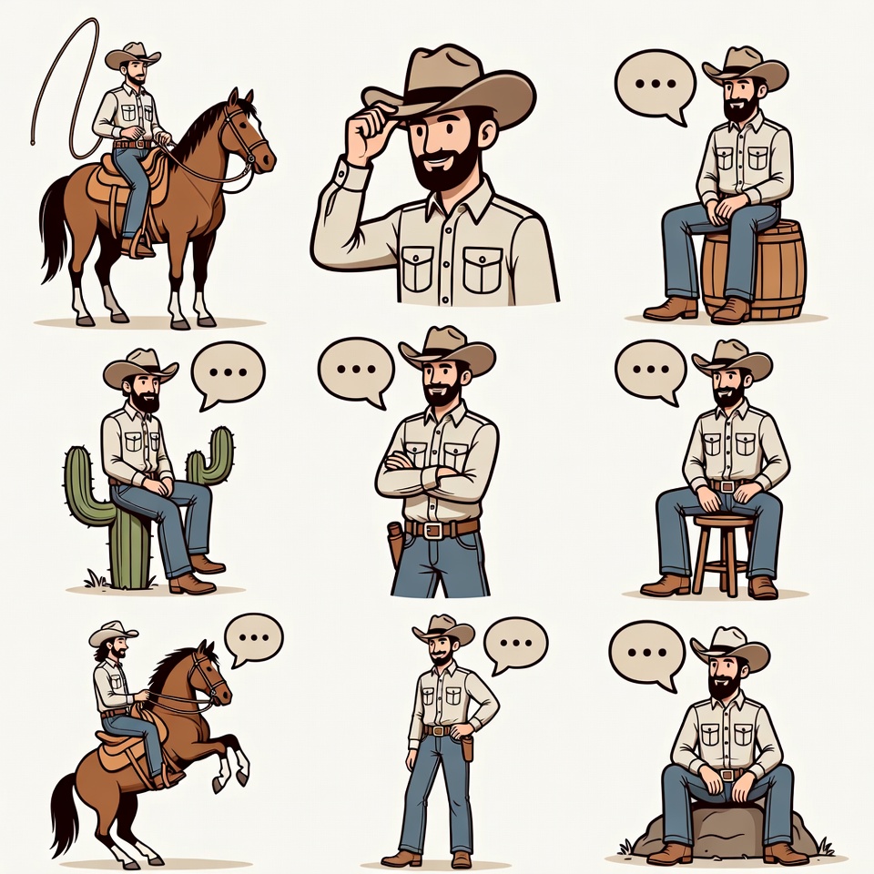 A collection of cartoon illustrations features a bearded White cowboy in a wide-brimmed hat, button-up shirt, jeans, and boots in various poses. He rides a brown horse, stands confidently, sits on a barrel or cactus, and appears with speech bubbles. Additional elements include a lasso, rearing horse, and rocky ground on an isolated white background.