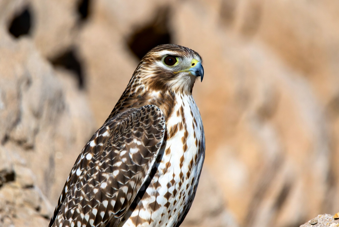 avian, bird, bird of prey, brown feathers, falconry, feathers, nature, perched, predator, raptor, red-tailed hawk, rock, stone background, white spots, wild bird, wildlife, yellow beak, yellow eyes, hawk