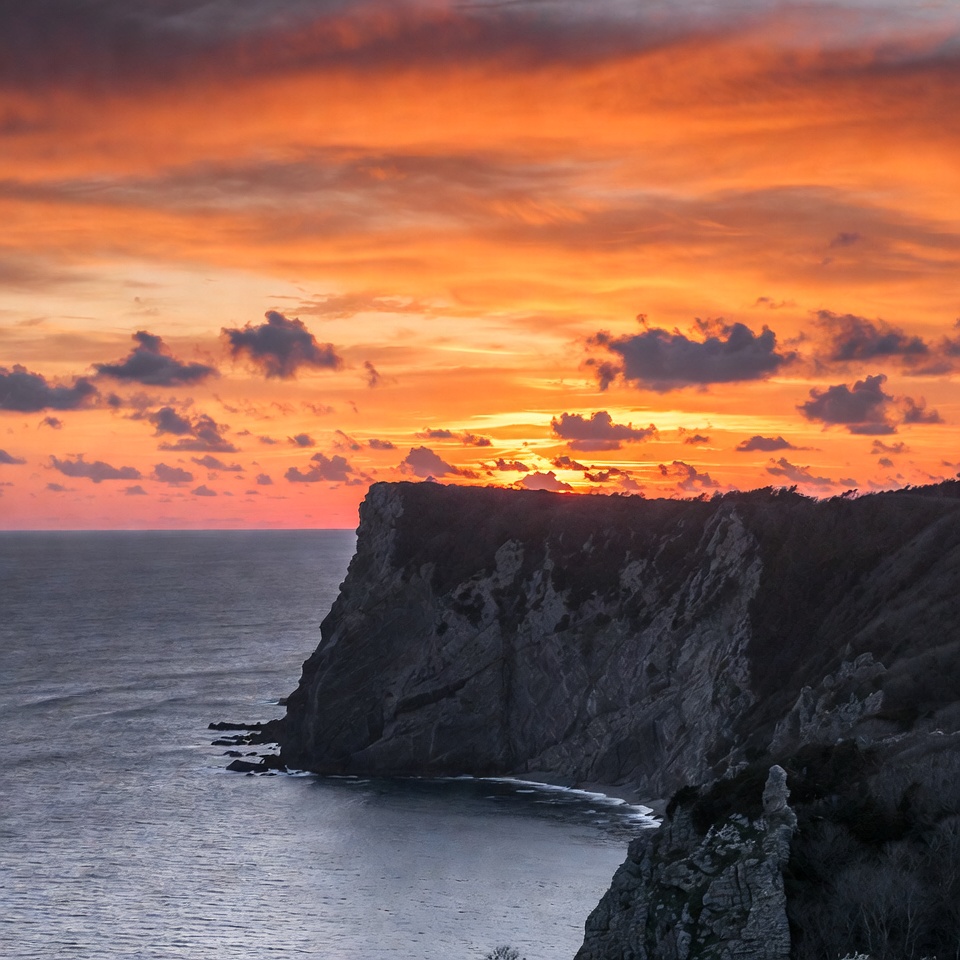 beach, cliffs, clouds, coastline, dramatic sky, golden hour, horizon, landscape, nature, ocean, orange sky, red sunset, rocks, rocky cliffs, sea, seascape, shore, sky, waves, sunset