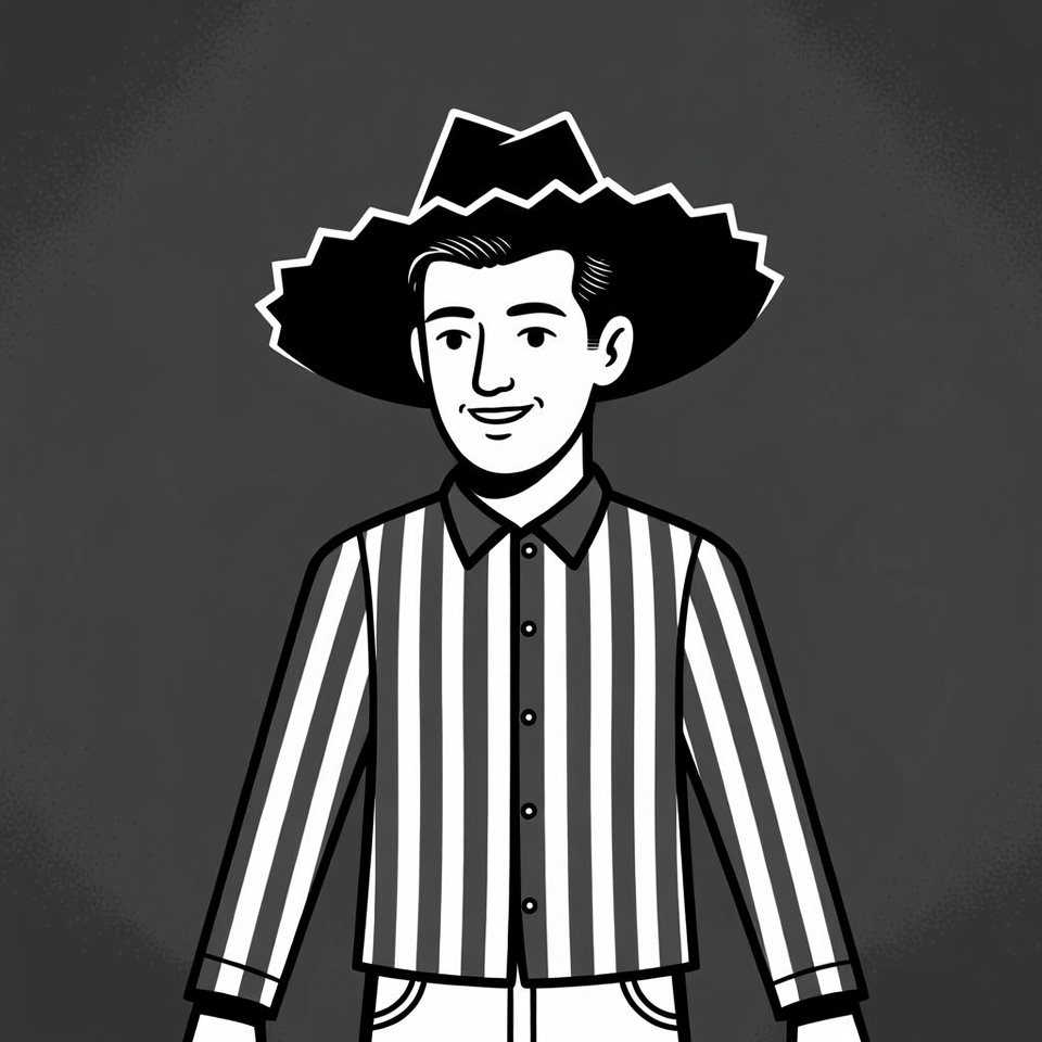 White, black white, collared shirt, hat, illustration, isolated background, line art, male, smiling man, sombrero, striped shirt, young man, cartoon man
