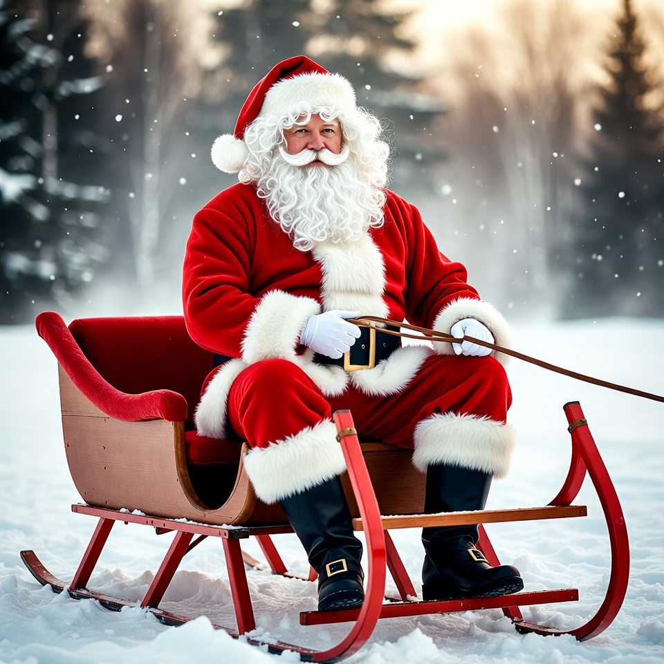 Santa Claus with a white beard and red hat sits in a wooden red sleigh on snowy ground. He wears a traditional red velvet suit with white fur trim and black boots, holding reins in his gloved hands. Snow-covered evergreen trees surround him in a winter forest setting.